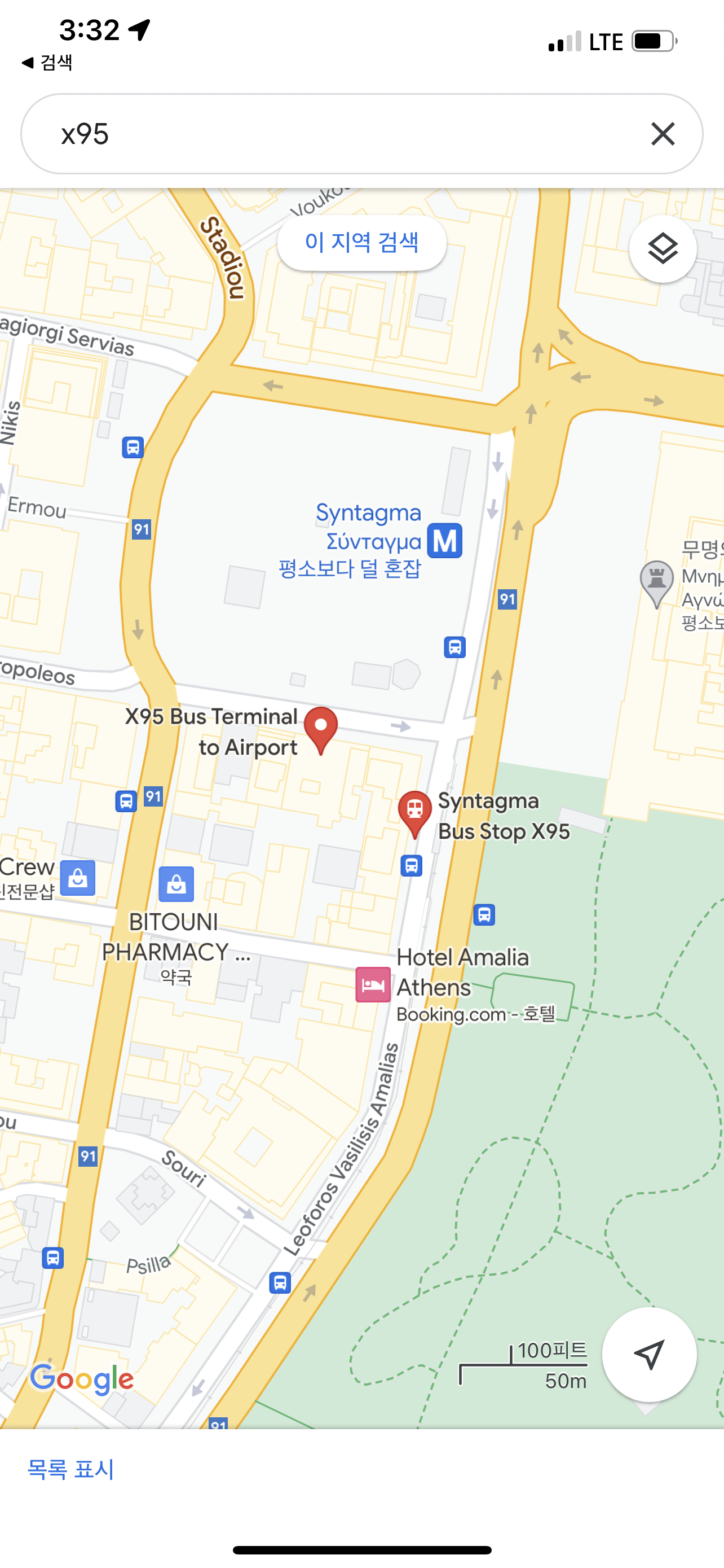 공항에서 X95번 버스를 타고 신타그마 광장에 내려